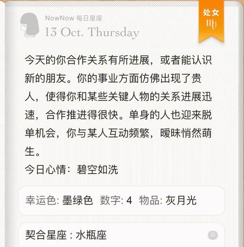 今天,白羊座应该抓住当前的机会,鼓励自己尝试新事物,探索未知的星球。白羊座可以给自己一些时间,从别人那里找到动力,想象未来的生活,并形成一个合理的计划。如果白羊座善待自己,用勇气和信念抓住机会,我相信它可以获得良好的回报。