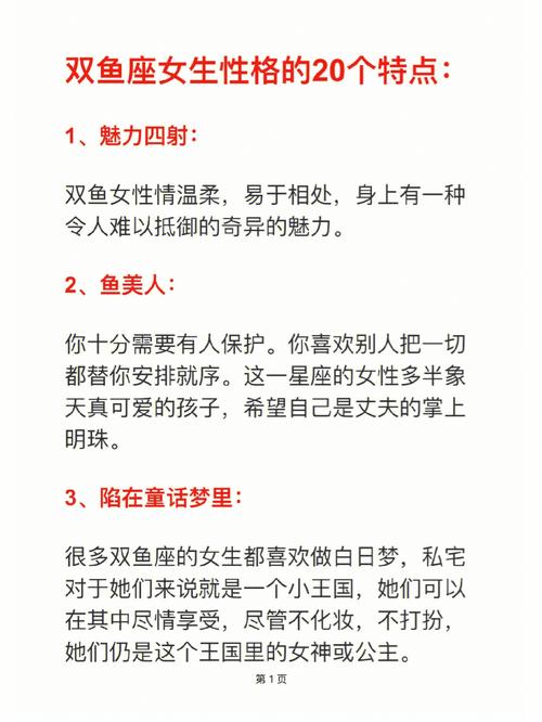 性格:双鱼座女性最重要的性格特征是友好和充满活力。他们温柔、爱、勇敢、博爱,积极乐观,正义感强,性格优雅、坚韧、诚实。心态和行动充满了正义和信仰,为他们的心和身体注入了大量的活力,但也为朋友和社会注入了活力。