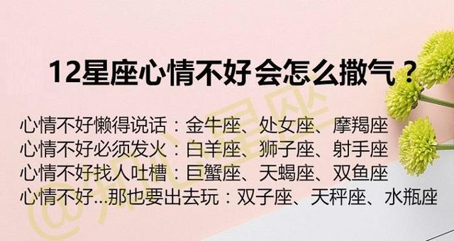 摩羯座当摩羯座的心情不好时,他们会变得非常疑虑和焦虑。他们可能会想很多,但是不知道该怎么办。因此,当你发现摩羯座的朋友心情不好时,你需要耐心地与他们沟通,帮助他们理顺思路。