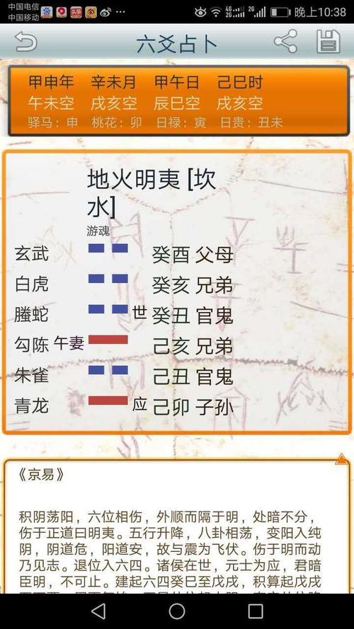 地火明夷卦是六十四卦之一,由下离上坤组成。正位上离下坤,为明夷卦。 明夷意味着昏暗,就像烛光熄灭,夜晚昏暗,暴风雨。明夷卦描述了一种情况,当事情达到无法控制的程度时,爆发出来。 明夷卦的核心是“我行其道,命运也”,它警告人们要与天道合作,这样才能走得更远,走得更远。